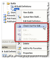 but is now part of the TFS Sidekicks package and is one of my favorite features. This add-in gives you the ability to right-click on a build type within the Team Explorer pane (in Visual Studio) and select "Check Out for Edit..." which will then check out the build type's TFSBuild.proj file (or whatever it may be named) and open it for editing. Accordingly, there are also menu options for checking the changes back in or rolling the changes back.