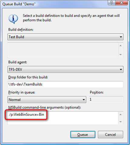 These properties can also be specified in the Team Explorer "Queue Build" dialog: